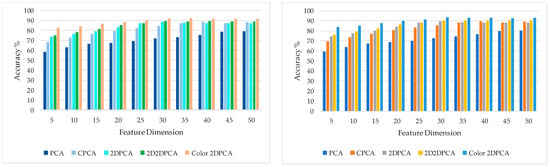 For color information, there have been some scholars [,,] who have noticed its importance to face recognition. Color face recognition is usually conducted on each color channel and the final result comes from the fusion of the three color channels. Similarly, CNN networks make full use of three color channels of RGB for feature extraction, respectively. All of them omit the inner correlations among color channels. A color channel fusion method using a joint dimensionality reduction algorithm was proposed by [] which can effectively improve the performance of color face recognition. In contrast, color 2-dimensional principal component analysis (2DPCA) is based on the concept of color value including three channels, which devotes to making full use of color information and the correlation between color channels. Color 2DPCA is devised to combine color and spatial information. It still has good robustness for the test and training set with large differences. So, color 2DPCA provides an effective way to improve the robustness of CNN.