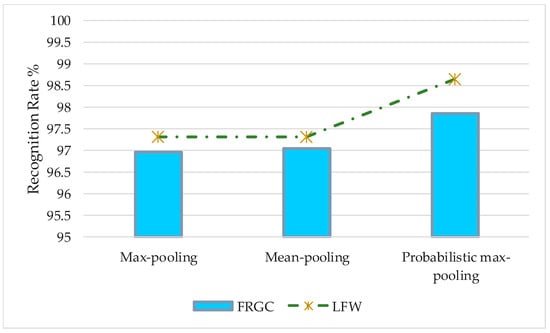 To evaluate the effectiveness of the pooling method on robustness and recognition performance, two benchmark databases, FRGC and LFW, were chosen for test set. In this experiment, we compared the accuracy of the proposed algorithm C2D-CNN under different pooling functions. We set the value of weight ratio to be 0.6 on FRGC database and 0.7 on the LFW database. The experiment includes three groups of comparison experiments: max-pooling, mean-pooling, and probabilistic max-pooling. The experimental results are shown in Figure 18.