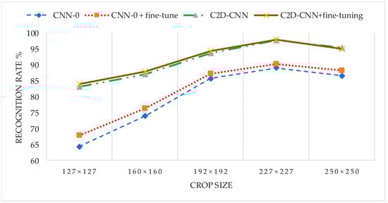 As can be seen from the experimental results shown in Figure 19, the difference of recognition performance between the fine-tuned network and original network is very small, especially for the proposed model in this article, which is almost no difference. The experimental results show that when there is big difference between test and training set, fine tuning cannot solve the problem of low recognition rate well, but the introduction of the color 2DPCA feature is more effective than trimming CNN in improving the performance of pre-training the CNN model. This is because the C2D-CNN model based on decision-level fusion combines two features that have complementary properties which integrates the advantages of the color 2DPCA feature and CNN feature so as to make the fused similarity more accurate and generalization ability enhanced.