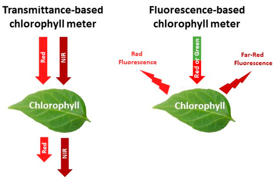 Most chlorophyll meters estimate the relative leaf chlorophyll content by measuring the absorbance and transmittance of radiation by the leaf of: (1) Red radiation, which chlorophyll absorbs; and (2) near infra-red (NIR) radiation, which chlorophyll transmits [19,43] (Figure 1). Absorbance of red radiation increases with chlorophyll content, resulting in higher chlorophyll meter values [39,44,45]. These sensors are referred to as transmittance-based chlorophyll meters. There are currently several commercially available transmittance-based chlorophyll meters, including the SPAD-502 and N-tester, which are almost identical, the more recent and low-cost atLEAF+ sensor, or the MC-100 Chlorophyll Concentration Meter (Table 1).