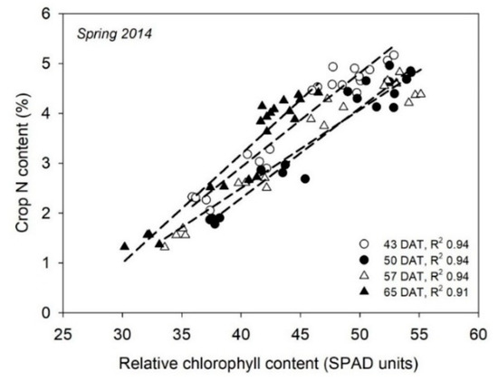 In a review article, Fox and Walthall [19] concluded that chlorophyll meter measurements were, generally, strongly related to leaf and crop N content, with better relationships being obtained when used for single cultivars than across cultivars within a species. Many studies have reported linear relationships between chlorophyll meter values versus crop/leaf N content for measurements made at a particular time or growth stage [38,50,55,67,68]. However, some studies have reported a plateau response, where, at relatively high N contents, the linear relationship tends to “flatten out” [32,53]. This plateau response is similar to that reported at relatively high leaf chlorophyll contents, which was referred to in Section 2.1.