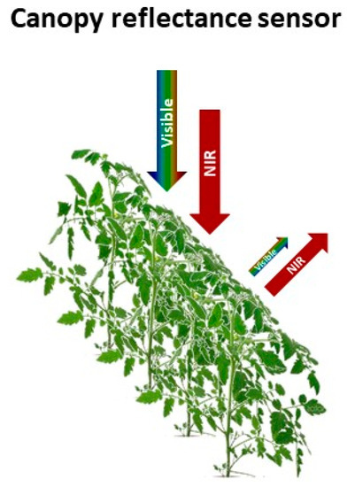 Several studies have examined proximal canopy reflectance sensors in tomato crops, both for determinate processing tomatoes and for indeterminate tomatoes for fresh consumption. Gianquinto et al. [123] compared several vegetation indices, derived from measurements made with the MSR-87 Multispectral Radiometer, to assess the N status and yield of open field processing tomatoes, and observed that GVI and GNDVI were the most effective vegetation indices. Working with greenhouse-grown indeterminate tomatoes and the Crop Circle ACS 470 sensor, Padilla et al. [55] reported that the NDVI and RVI indices were the most effective vegetation indices to assess crop N status, and that these two indices were slightly more sensitive than the GNDVI and GVI. The better performance of NDVI and RVI in indeterminate tomatoes contrasted with the better performance of GNDVI and GVI in processing tomatoes [123]. Because of the different approaches to assess crop N status, the studies of Gianquinto et al. [123] and Padilla et al. [55] with tomatoes are not directly comparable; the former author considered leaf N content, while the latter author considered whole plant N content. Additionally, different canopy reflectance sensors were used. However, taken together, these two studies suggest that NDVI, RVI, GNDVI, and GVI are sensitive indices of the crop N status of tomatoes.