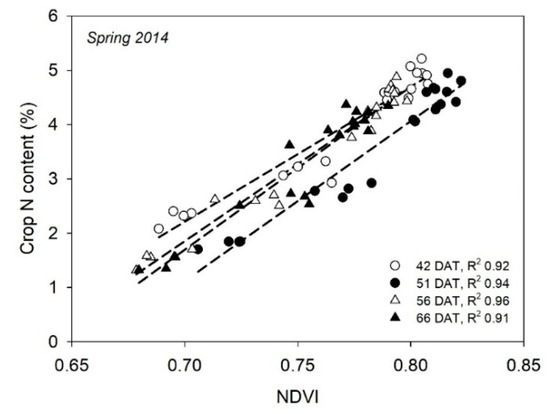 Linear relationships of the Normalized Difference Vegetation Index (NDVI), measured in the upper part of the crop canopy with a Crop Circle ACS 470 sensor, to standing crop N content from a greenhouse-grown cucumber crop in Spring 2014 carried out in southeast Spain. DAT is days after transplanting and R2 is the coefficient of the determination of linear regression.