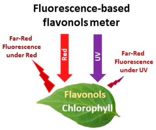 A newer approach that has been used to monitor the crop N status proximally is based on the estimation of relative flavonols content from fluorescence measurements [28]. Flavonols are a class of polyphenolic compounds, which are carbon-based secondary metabolites whose content in leaves increases under conditions of lower N supply [126,127]. Leaf flavonols content is, generally, inversely related to leaf chlorophyll content [38]. Relative flavonols content is estimated by flavonols meters using the chlorophyll fluorescence (ChlF) screening method [128,129,130]. The measuring principle is based on the emission of fluorescence in the red to far-red region of the light spectrum by mesophyll chlorophyll when excitated with red and ultra violet (UV) radiation [46,131,132]. Flavonols that accumulate in the leaf epidermis absorb appreciable amounts of UV radiation and reduce the emission of far red chlorophyll fluorescence under UV excitation, but do not affect the emission of far red chlorophyll fluorescence under red excitation (Figure 5). The flavonols content is then estimated by comparing far red chlorophyll fluorescence under red and UV excitation [38,130,133]. Flavonols meters measure a dimensionless value that is strongly related to the actual amount of flavonols [28,43,134].