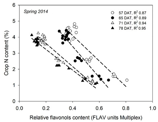 A number of studies have been conducted with greenhouse-grown cucurbits in soil. In muskmelon, flavonols content and NBI, measured with DUALEX, were very strongly related to crop N content and NNI for most of the crop cycle [58], suggesting that these measurements have potential to accurately estimate crop N status throughout a muskmelon crop. In cucumbers, Padilla et al. (unpublished) reported strong relationships between flavonols content, measured with MULTIPLEX, and crop N content in all dates of measurement (Figure 6). In two cucumber crops, Padilla et al. [66] found very strong relationships between both flavonols content and NBI, measured with MULTIPLEX, with crop NNI for cucumber crops during autumn and spring growing cycles. However, there was a notable difference in the flavonols content between the spring and autumn grown crops. for equivalent crop N status, that prevented the derivation of common relationships for both cycles [66].