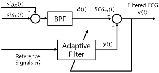 ANC is used to remove noise from the measured signal [22,23,24] and its block diagram is depicted in (Figure 2). is a sequence of and equals , where i denotes the iteration. is the original ECG and is the noise from the motion of the subject and the vehicle. The reference signal is filtered through an adaptive filter to produce the output . Then, the error signal is obtained and used as the output of ANC.