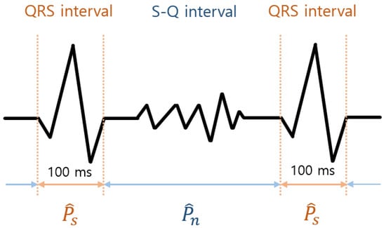 Also, is used as a signal quality index. Because and are difficult to distinguish and obtain in practice, we assumed the original ECG power is the same as the power of the 100 ms centered around a true R peak as we considered the dominance of their power based on the quality index of ECG [27]. In the ECG measured by the cECG sensors, the complete PQRST wave is difficult to obtain, but complete QRS interval can be obtained. Therefore, the S-Q interval is considered the interval including only the noise. In this study, is defined as