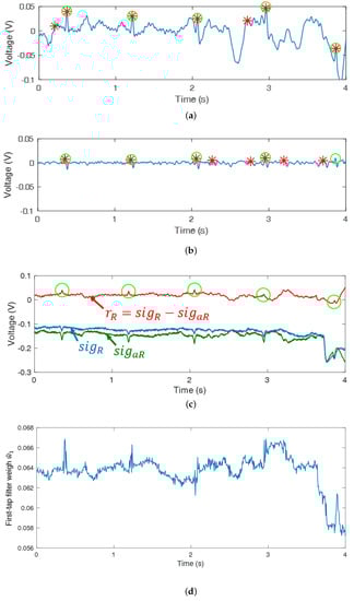 Although ANC reduces noise, it cannot improve R peak detection because it reduces the power of QRS interval (Figure 3) as well. To investigate this problem, has to be examined. In and , is expected to be removed and only the signal correlated with the is expected to remain only motion information by subtracting each other’s cECG obtained from the adjacent cECG sensors. However, and are still correlated with because is not completely removed (Figure 4c). As a result, the correlation condition is not satisfied and the power of is reduced after filtering. In addition, the QRS interval of is intermittent and the power of at the QRS interval is large enough to ignore . Therefore, within the interval, Equation (4) approximates . As a result, the filter weight is updated to remove from the output signal of the ANC even though the filter weight had been updated to reduce before the QRS interval. When (Figure 4a) is filtered through ANC, the power of the filtered ECG (Figure 4b) decreases at the QRS interval and more incorrect R peaks are detected, where the green o denotes the true R peak position and the red * denotes detected R peaks. Within the QRS interval, the first-tap filter weight dynamically changes (Figure 4d) and the updated quantity of the total filter weight increases (Figure 5a) compared to the S-Q interval (Figure 3). The filter weight has been continuously updated to remove the noise that exists in the S-Q interval, but within the QRS interval is large within the short time frame, causing the filter weight to be updated significantly to remove .