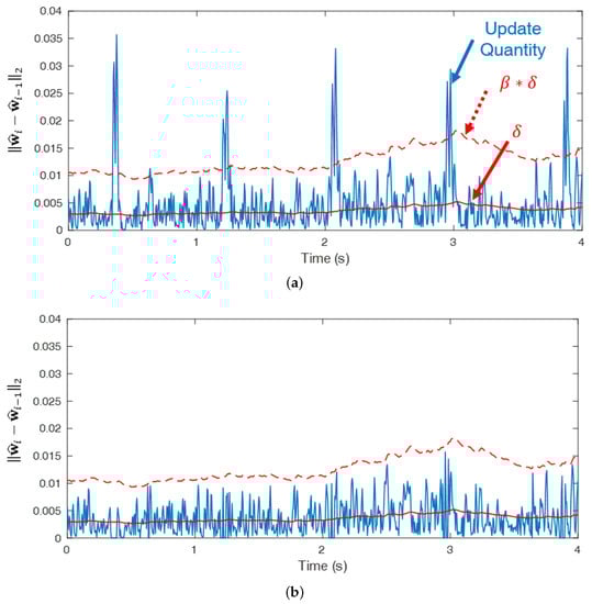 Update quantity of the filter weight: (a) update quantity by APA and (b) update quantity by the proposed algorithm using RVSS APA.