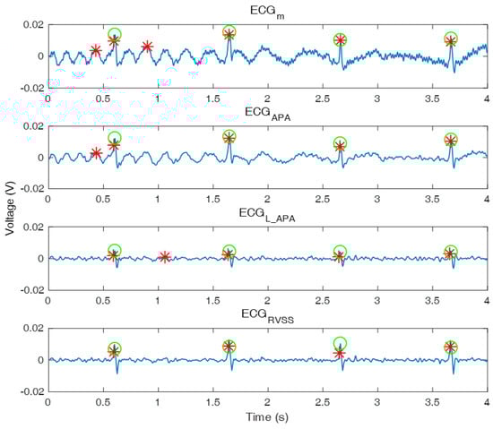 In addition, for was 5.62 ± 5.00% larger than of although for was −0.33 ± 2.92% larger than of in the indoor experiments. Likewise, for was 5.48 ± 3.28% larger than that of although for was −0.20 ± 0.83% larger than that of in outdoor experiments. The reason increased is that the proposed algorithm could filter ECG to reduce the power of the noise within the S-Q interval than the ANC using APA did. Thus, the proposed algorithm could prevent the detection of incorrect R peaks outside the search window, decreasing FP.
