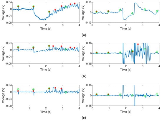 The two largest PIR were shown in Section 3 and Section 4. In those sections, the subjects could drive fast without curves, speed bumps, and stops so that only trivial and moderate noise occurred due to the vibration of the vehicle caused by fast driving and there was no abnormal noise. As a result, the proposed algorithm could reduce the noise and conserve the QRS interval compared to the ANC using APA. In the other sections, the PIR were lower than or similar to the PIR of the total section. There were curves, speed bumps, stops, and unpaved roads, so abnormal noise occurred. The severe vibration of the vehicle (i.e., driving on unpaved roads) resulted in noise which had statistical characteristics similar to QRS interval of original signal so that the QRS interval could not be distinguished (Figure 7a; left plot). Also, the separation of the body and sensor (i.e., steering, driving over speed bumps) resulted in large noise which caused wrong update of the filter weight (Figure 7; right plot). As a result, neither algorithms could reduce the abnormal noise (Figure 7b,c) and PIR did not increase. In conclusion, the performance depended on the type of noise. The proposed algorithm achieved improved results when moderate noise was mixed, but it showed the limitation that abnormal noise was not reduced.