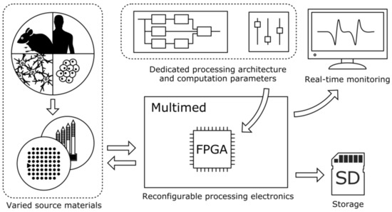 As depicted on Figure 1, Multimed is a system that is capable of acquiring and processing signals from various source materials, with a reconfigurable processing architecture taking advantage of an FPGA (Field Programmable Gate Array) chip. Recorded signals can then be displayed in real-time, stored, or utilized to generate feedback stimulation triggers. Overall, it may be used as a standalone analysis station for fundamental research or as a prototyping architecture for implantable prosthetics.