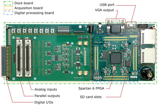 The third and last board is an interface board, which includes multiple LEDs, buttons, and switches, but also generic digital I/Os, a 3.5 mm TRS jack output, a VGA output, a micro-B USB port, a JTAG connector, and four SD card slots. It is also the board that distributes all the power supplies throughout the system: both the processing and acquisition board are plugged into and powered by it.