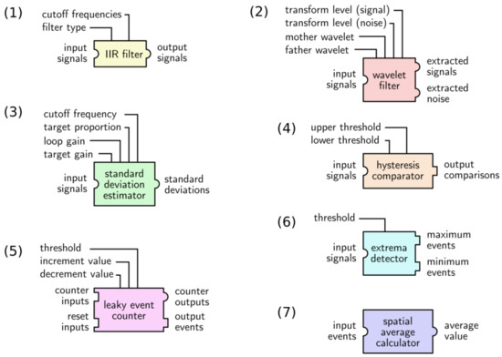 The processing functions described above are commonly used in isolation (e.g., isolating AP waveforms may only require one IIR filter bank), but they can be assembled into more complex processing units (e.g., adaptive AP detection requires a combination of a filter bank, threshold computation with a standard deviation estimator, and a threshold comparator). To make complex architecture design easier, such combinations have been made available as building blocks, as listed in Table 2 and detailed in Figure 6. In order to maintain full configurability, all of the parameters from the sub-blocks (listed in Table 1) are accessible in these functions.