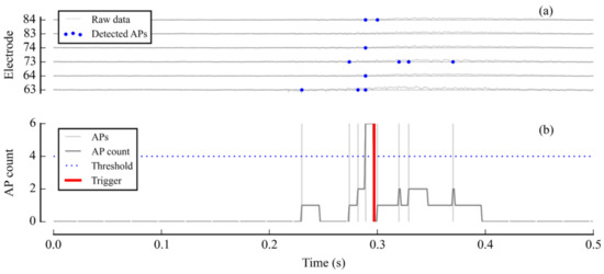 A stimulation command triggered by synchronized spiking activity in a neuron culture. The trigger was set off when more than four APs were detected across six selected channels in a 25 ms time window. (a) Unprocessed data on one of the channels of interest; (b) AP detection on the six channels of interest and, (c) Illustration of synchronization detection: AP count and related trigger.