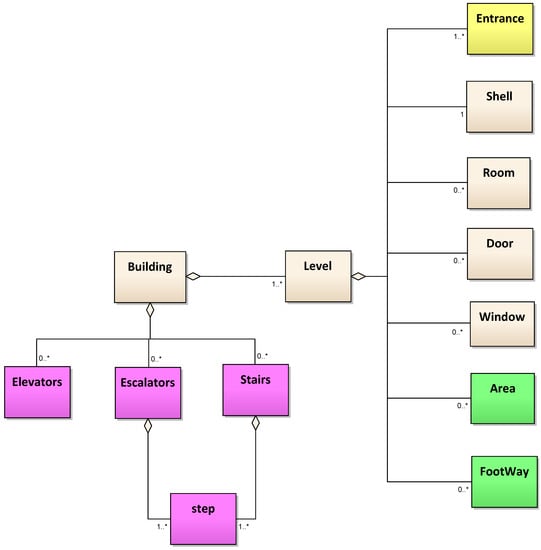Following the above requirements, we design a data model, modifying the indoor tagging schema from the previous work of [], and focus on modeling the connections between building parts. A set of new approaches is proposed to map the connecting spaces of inter-/intra-floors inside buildings. Based on building footprint data, we adopt OSM nodes and ways to represent the location and shape of indoor components, using semantics to capture the third dimension. Besides, OSM relations are also used to describe the connections between various indoor parts. Our approaches allow the model not only to store outer characteristics and the inner building components, but also to capture the connectivities between them, which enables the use of 3D information to generate routes that are close to the real environments. Figure 1 shows the UML diagram of our data model. Basically, the modeling of built environments in the proposed model consists of four parts: (1) modeling of floors and inner building parts (in light gray); (2) modeling of horizontal elements inside floors (colored in green); (3) modeling of vertical elements that connect floors (colored in purple); (4) modeling of connections between outdoor and indoor environments (colored in yellow). In the following sections, we will describe the proposed data model in more detail.