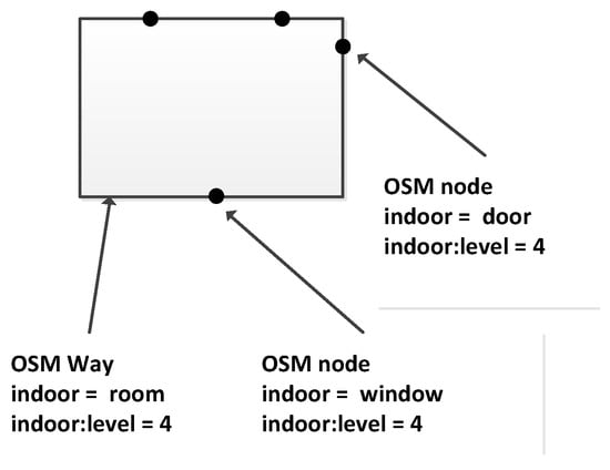 Following the approach proposed by IndoorOSM, we use an OSM relation to represent a building, which has general building information attached, such as address, postcode and name. Each building relation is a main relation and composed of level relations (representing floors). Each level contains its outer boundary (shell), level number and height, which is the distance between the current level and the next level above. For each level, we model inner building parts in a similar way to IndoorOSM, but an additional tag “indoor:level = *” (* is a wildcard standing for any tag value) is introduced for each building part to clearly indicate the level to which this building part belongs. This would help facilitate the editing and processing of the OSM indoor data. Each room is defined by a polygon and can have some openings, such as windows and doors. The location information of the openings (doors and windows) is provided with a node representing their centric position, as shown in Figure 2. Note that although in normal situations, windows are not used for navigation purposes, they are very important for routing in some special situations (e.g., fire evacuation).