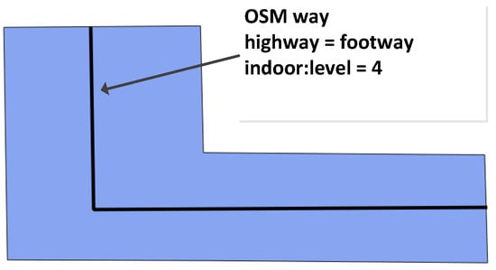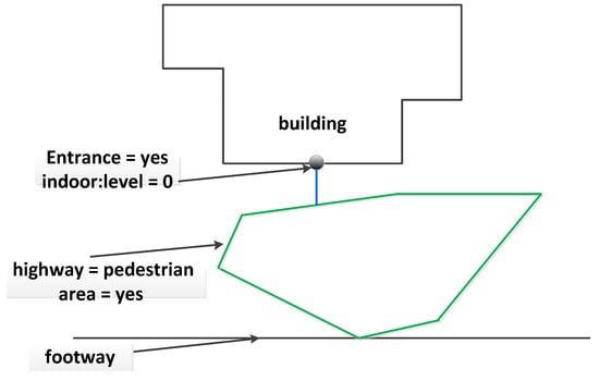 Entrances and exits are the main building components used by people to enter or exit the buildings and play an important role in connecting indoor and outdoor networks. In this study, the entrances and exits of buildings are modeled as OSM nodes with tags “entrance = yes/exit”, and “indoor:level = *”. They are connected to indoor networks of the same floor. To integrate the indoor networks with street networks, in this paper, we apply two mapping approaches: (1) explicitly mapping the path to entrances/exits; an OSM way is added to represent the foot ways that link outdoor road networks and entrance/exit nodes, as shown in Figure 9; (2) using OSM closed ways and mapping the open areas that connect indoor and outdoor environments; the closed ways have the tag “area = yes” attached and are connected to entrances/exits and outdoor road networks (see Figure 10).