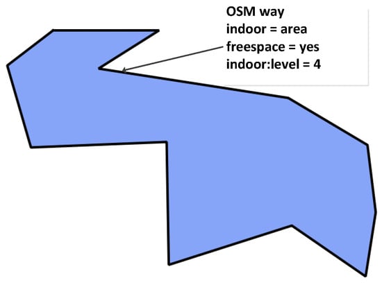 Indoor horizontal spaces, such as corridors, halls and passages, play an important role in the navigation at each floor of a building, connecting rooms and doors. These spaces are usually areas that are without walls and are where people can walk freely. In the new model, we use an OSM closed way to map the outline of each indoor space and attach the tags “indoor = area” and “indoor:level = *”. Because these indoor areas can have not only regular shapes (see Figure 3), but also complicated geometries (see Figure 4), in the new data model, we apply two different ways to represent the horizontal connections at each floor: (1) For regular shapes (like Figure 3), we use a direct mapping approach and explicitly map foot ways that people can walk along inside buildings. Each indoor foot way is represented by an OSM way, attaching the tags “highway = footway” and “indoor:level = *”. The indoor foot way can be directly derived from floor plans. Such an approach allows foot way information to be directly integrated into the generation of navigation graphs, without additional processing of the geometric information of indoor spaces. (2) For the areas with complex geometries (like Figure 4), we introduce a new tag “free_space = yes” and attach it to the way of the indoor space. This tag indicates that special processing is needed to derive an appropriate pedestrian-friendly network for routing. More details about deriving navigation graph from complicated geometries will be presented in Section 3.1.