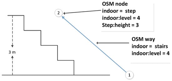 For the collection and management of building information, a data model is needed to describe indoor spaces for navigation applications. Typical data models for modeling indoor environments are the building information model (BIM) and the City Geographic Markup Language (CityGML). A representative example of BIM is the Industry Foundation Classes (IFC). CityGML is an Open Geospatial Consortium (OGC) standard. Both BIM and CityGML consist of a number of classes and contain highly detailed and semantic information on the built environments. Based on these models, some researchers have developed a variety of methods to generate graphs for navigation purpose [,]. However, these models carry too much architectural information such as structural and reinforcing information, which are mainly designed for visualization purposes and not essential for navigation. Along with the indoor mapping activities of the VGI communities, a set of indoor modeling and mapping proposals for OpenStreetMap has emerged. Based on 3D building modeling frameworks and ontologies, [] proposed IndoorOSM with the intention of mapping all relevant information for indoor routing. Although it has some deficiencies (e.g., directly using OSM IDs to describe the connections between floors) and is currently not embraced by the OSM community, some of its proposed tagging schemes can still be used for the mapping of indoor objects like rooms, windows and doors. Simple Indoor Tagging [] is also a tagging schema proposed for indoor mapping and mainly focuses on public buildings (e.g., train stations). Another indoor-related proposal is the Full 3D Buildings (F3DB) schema [], which is designed with concern for its compatibility with existing standards, such as CityGML and IFC. However, these tagging schemas lack consideration of detailed mapping of the connections between indoor elements (e.g., stairs), which would cause problems in deriving the actual geometric distance for indoor routing.