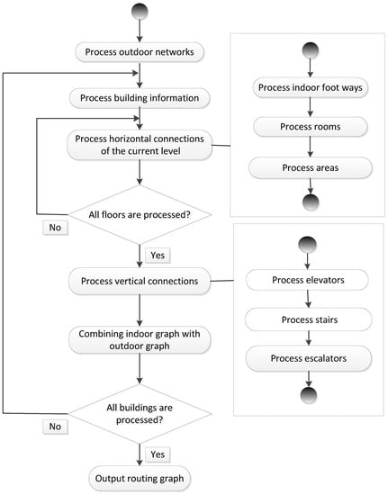 To combine indoor and outdoor route planning, a 3D routing graph is required. In this section, we provide a workflow that gives a guideline for processing the data of outdoor networks and the building components of different types. Basically, our workflow consists of five steps (as shown in Figure 11):
