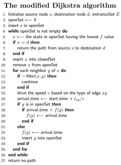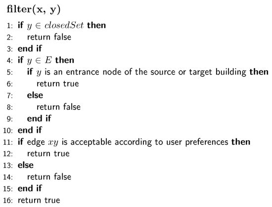 Figure 12 shows the structure of the modified algorithm for indoor-outdoor route planning. In the initialization of the algorithm, the developed algorithm is given with two nodes, i.e., the source node and target node. Each of these two nodes corresponds to either a room in a building or a point in outdoor road networks. Following the basic principle of the Dijkstra algorithm, the algorithm maintains two sets: , which stores the nodes waiting for extensions, and , which stores the nodes that have been extended. In our algorithm, we introduce a new set to store the entrance nodes of all buildings and use it for filtering nodes. The algorithm first selects the node x with the lowest cost, expands it to generate its successors and uses them to update the . In the generation of successors, we introduce a filter function for filtering out irrelevant edges and nodes (Figure 13), limiting the searching space. The filter performs three functions: (1) skip the next node if it is in ; (2) check if the next node is an entrance node and which building it belongs to and remove it from extensions if it does not belong to the target building or the source building; (3) check if an edge should be filtered out according to user preferences (e.g., using elevators or stairs). In Line 15 (Figure 12), we derive the traversing speed of edges based on the types of the corresponding building parts: (1) for elevators and escalators, the speed is directly extracted from OSM data (e.g., elevator speed = 5 m/s, escalator speed = 2 m/s); (2) regarding stairs, we calculate the gradient of the stairs and use it to obtain the ascending and descending speeds, according to the model provided in the works of []. From Line 17–24 (Figure 12), the successor y with the newly estimated arrival time is examined and is used to update for further extensions.