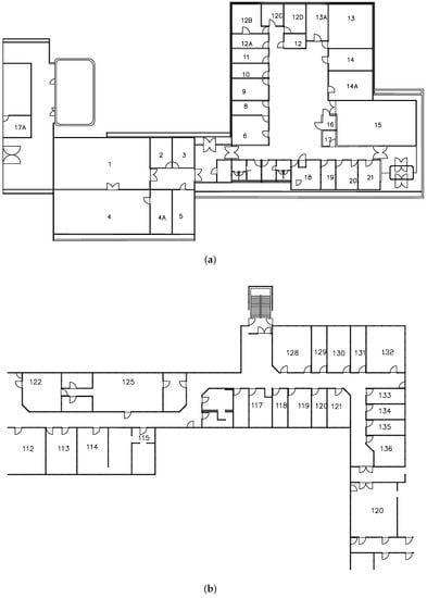The floor plans of the Geography building. (a) Floor plan of the ground floor; (b) Floor plan of the first floor.