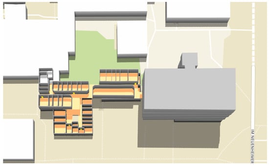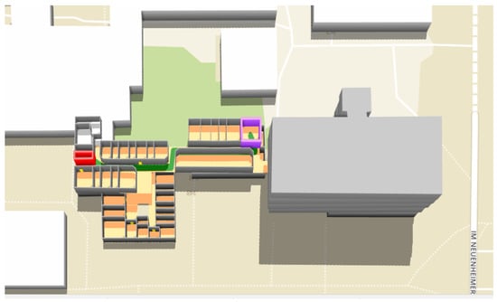 Using the data model presented in Section 2, we have mapped two buildings of the campus of Heidelberg University: the Mathematikon building (Berliner Str. 45) and the Geography building (Im Neuenheimer Feld 348). The Mathematikon building contains seven floors (five above the ground and two floors underground), which are connected by a couple of stairs and elevators. On each floor, there is a group of rooms with different usages. In the Geography building, it consists of two floors and one stair. We gathered the indoor data based on the evacuation plans of the buildings, using the Java OpenStreetMap Editor (JOSM). A Java-based routing engine has been built, employing the modified Dijkstra algorithm (presented in Section 3.2) to calculate the shortest route. Based on a JavaScript library named osmbuildings (www.osmbuilidng), we developed a web application tool to render geo-data on 3D maps [] and used it for 3D visualization of the indoor environments and the computed routes in this study. Our integrated indoor and outdoor route planning system was tested in three cases: (1) navigation within one building; (2) navigation from an outdoor point to a room inside a building; and (3) navigation between two rooms in different buildings. The results from the application to these two cases are presented in Section 4.1, Section 4.2 and Section 4.3, respectively (see https://www.youtube.com/watch?v=60Ab7f8YZ7w for a demonstration).