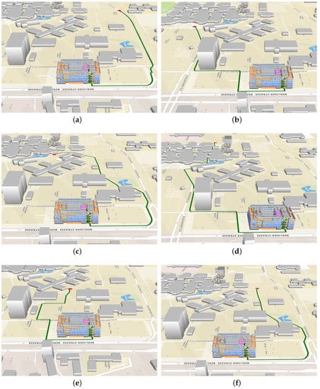 An overview of integrated indoor and outdoor routes (in green) from three outdoor points (in red) to a room (in purple) in the Mathematikon building. The windows and the doors of the buildings are colored in blue and in yellow, respectively. (a) Route R1; (b) Route R3 (c) Route R5; (d) Route R7; (e) Route R9; (f) Route R11.