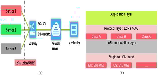 (a) LoRaWAN network architecture; and (b) LoRaWAN protocol stack.
