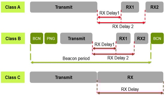 Taking into account the application needs, The LoRaWAN specification defines three classes available for different power usage strategies [26]. These classes are illustrated in Figure 4 and can be briefly described as follows: