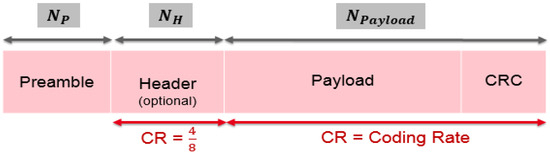 This part presents the LoRa frame definition. This frame starts with a preamble which is used for the synchronization between the receiver and the transmitter [9,10,11]. After the preamble, an optional header carries the size of the payload and the information about the LoRa configuration. It is noted that the header is always encoded with a . The payload is encoded with a variable CR. An optional Cyclic Redundancy Check (CRC) is sent at the end of the frame. Figure 5 depicts the LoRa frame content.