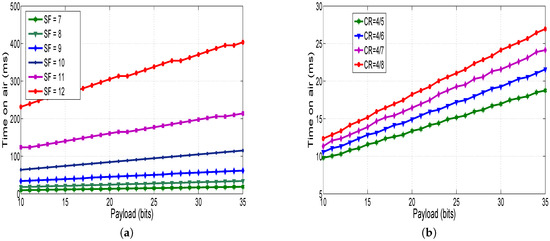 where ceil indicates the ceiling function, ; with when the header is enabled and when no header is present and ; with when the low data rate optimization is enabled and for the other case. Then, the time on air is the sum of the preamble and the payload duration: