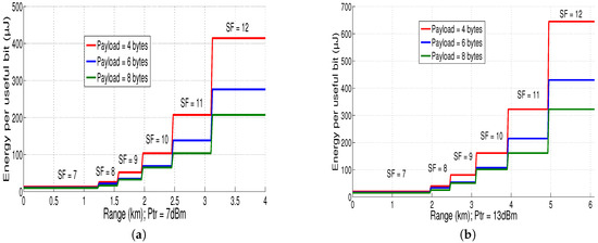 (a) vs. LoRaWAN range at different payloads ( = 7 dBm); and (b) vs. LoRaWAN range at different payloads ( = 13 dBm).