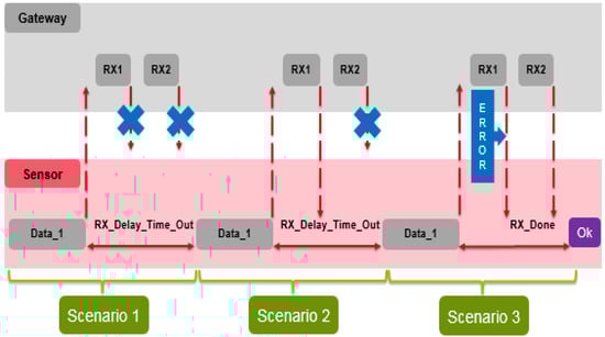 Figure 14 depicts possible scenarios of the sensor node based on LoRaWAN Class A. The first scenario is to transmit data to the gateway without receiving both RX1 and RX2. The second one is to transmit data and receive RX1 without receiving RX2. The third scenario is to transmit data and demodulate RX1 which contains transmission error, so that the node must demodulate RX2.