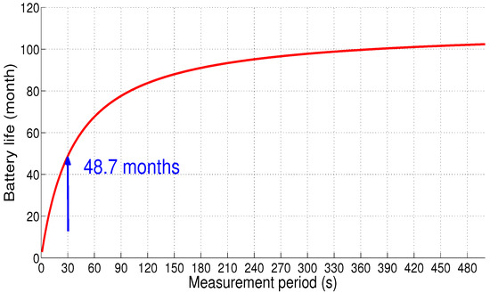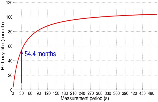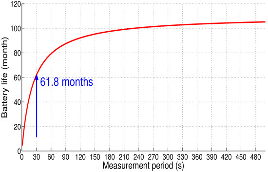 Figure 16 depicts the battery life as a function of measurement period, with a capacity of 950 mAh and a supply voltage of 3.3 V, the sensor node autonomy is estimated at 5 years, 1 month and 24 days (61.8 months) when the measurement period is equal to 30 s.