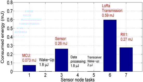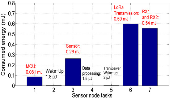 Figure 15 presents the power consumption amount by each task of the communicating sensor. As indicated before, the main energy consumers are the microcontroller unit ( = 0.061 mJ), the sensor unit ( = 0.26 mJ) and the RF unit ( = 0.59 mJ). It is noted that the transceiver part is the main energy consumer in the sensor node. In this case, the LoRa frame must be retransmitted by the sensor node. As indicated in [34], if the downlink message is lost for any reason, the LoRa specifications recommends to transmit packet up to eight times.