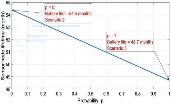 where and are the total consumed energies using Scenarios 2 and 3, respectively. Using results in Section 6.3.2 and Section 6.3.3, the sensor node autonomy as a function of probability p is given in Figure 21. We remark that the sensor node lifetime decreases from 54.4 months when p = 0 (which is the sensor node lifetime using Scenario 2) to 48.7 months when p =1 (the probability that Scenario 3 occurs).