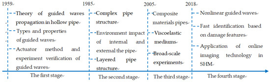 Guided waves-based damage detection and health monitoring technologies have produced plenty of research results over a long period of development. Gazis solved harmonic guided propagation along an infinite hollow tube by use of the elastic theory, successfully explaining the dispersion effect and multi-mode phenomenon of the guided waves from the theoretical view, which marked the start of the guided waves research [19]. Greenspon systematically investigated cylinder shell dispersion curves and displacement fields [20,21]. Silk and Bainton successfully categorized the guided waves in the cylinder shell into the symmetric longitudinal mode L(0, m) and torsional mode T(0, m), and the antisymmetric flexural mode F(n, m), and the category is currently in use [22]. Lowe et al. derived the guided waves dispersion equations in a layered cylinder shell [23,24]. Aristegui et al. and Chen et al. respectively studied the guided waves propagation issues in pressured water pipelines, focusing on boundary influences on the frequency dispersion and mode transform [25,26], and Elvira further explored guided waves travelling behaviors in a circular cross-section pipe filled with viscous liquid [27]. Yan et al. experimentally validated the dispersion effect and multi-mode of guided waves [28,29]. The picture of the ultrasonic guided waves damage identification stage is seen in Figure 1.