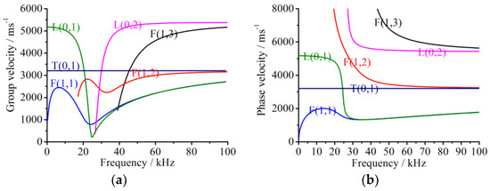 Dispersion curves of a steel pipe with an outside diameter of 70 mm and wall thickness of 4 mm. (a) Group velocity curves; (b) Phase velocity curves.