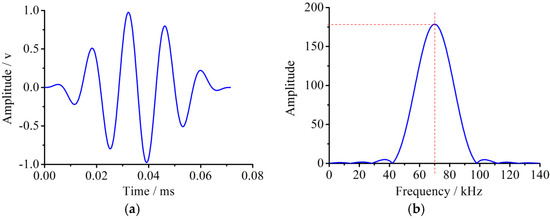 A five-peak impulse wave has some advantages such as a narrow pulse width and less frequency dispersion. Therefore, an L(0, 2) mode five-peaks impulse wave with the center frequency of 70 kHz and the amplitude of 5 V, which is modulated by a HANNING window function, is chosen as the detection signal in this paper. The excitation signals in the time domain and frequency domain are shown in Figure 3, respectively. Figure 3a shows the normalized waveform in the time domain, and Figure 3b represents the corresponding wave in the frequency domain.