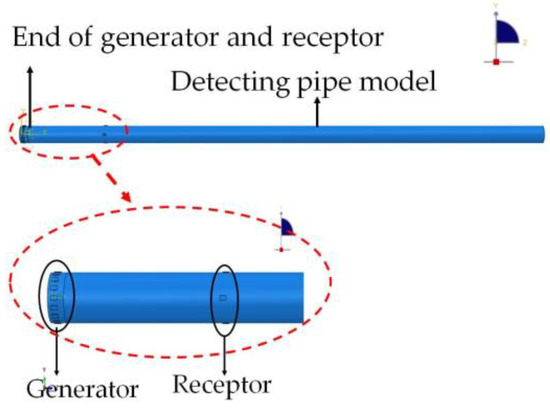 To generate an L(0, 2) mode guided wave for identifying the circumferential crack, a group of 16 piezoceramic elements simulating the PZT patch array used as actuators are uniformly arranged along the pipe model, and another group of four piezoceramic elements used as sensors are uniformly bonded on the surface of the model at the same end. The distance between the generator array and the sensor one is 50 mm. The pipe FEA model assembled with the PZTs array and sensor is shown in Figure 4, and the layout of the PZT arrays is shown in Figure 4.