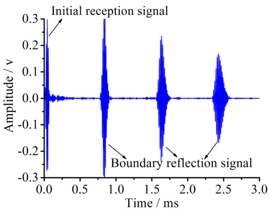Generally, the simulations are divided into two cases according to whether damages occur or not. One case is a healthy one, which has no damages along the pipe. The other is a damaged one, where artificial damages with a certain level are placed on the given positions. The electrical analog signals for the healthy pipe structure model extracted from a piezoelectric receiving element potential are shown in Figure 5. In Figure 5, the signal packages from left to right are the received initial signal and the boundary reflection signals, respectively. It can be obtained from the result that as a signal is propagating in a healthy pipe structure, the guided wave for the same excitation central frequency will be observed for a phenomenon of decreasing amplitudes because of the energy dissipation with an increase of propagation distances and reflection times, accompanying the phenomenon of an increasing signal package length in the time domain. For each of the received signal packages, a more than five-peak impulse is clearly observed due to the boundary superposition phenomenon. This is because the PZT sensing array is so close (50 mm) to the end of the pipe structure that the later part of the sensor signal might have a superposition with the boundary reflected front part of the same sensor signal.