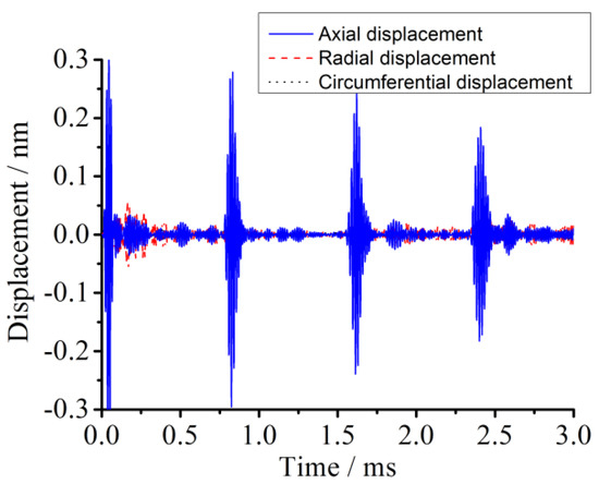 In order to verify whether the excitation signal is proximate to the expected guided wave with an L(0, 2) mode in the pipe detection simulation, three kinds of typical displacements along axial, radial, and circumferential directions at the given nodes are analyzed, respectively. Firstly, the axial, radial, and circumferential displacement curves are extracted and compared, as shown in Figure 6. Figure 6 shows that axial displacement amplitudes of the signal package at the same node in the pipe model are greater than the other two directional ones, indicating that the displacement distribution approximately complies with the L mode guided wave.