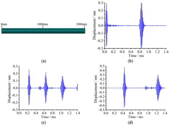Figure 7a shows the layout of three observation points located at 0 mm, 1000 mm, and 2000 mm from the left end. Figure 7b indicates the observed signal at the point of 0 mm. The first signal package represents the initial excitation signal and the second one is the received echo signal from the right end. Figure 7c shows the signal propagating through the point of 1000 mm. The first and third main signal packages represent the initial excitation signal and the reflection one from the right end, respectively, and the second main one represents that from the left end echo. Figure 7d denotes the signal travelling through the point of 2000 mm. The first main signal package is the initial excitation signal and the second main one is from the left end reecho. Through the displacement comparison at difference nodes shown in Figure 7, it can be concluded that the incident wave and boundary reflection ones will occur as a superposition phenomenon in the close end (connection) area.