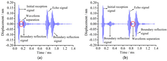 The nodal displacement signal at the beginning of separation of the incident wave and reflection wave in the simulation. (a) Initial reception signal; (b) First echo signal.