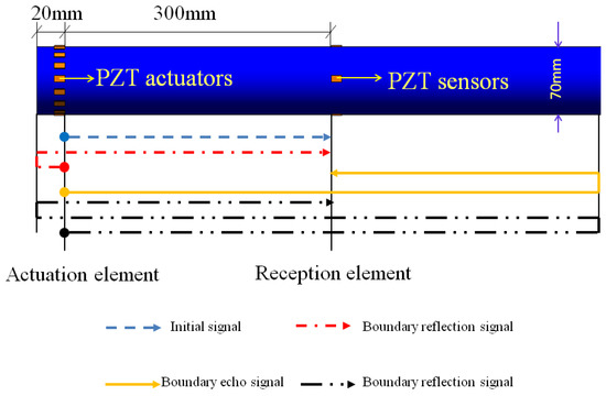 The identification of the signal separation range due to the boundary reflection superposition is important for the layout of PZT transducer arrangement. Appropriately arranging the transducer array to protect the signal from superposition may not only make installing PZT arrays much easier, but also increase the damage identification precision. In Figure 8a, the distance between observation nodes when the initial signal is separated and the connection (or end) place of the pipe is 305 mm. In Figure 8b, the similar distance for the echo signal is 415 mm. It is found that the distance for signal packages starting separation is closely associated with the signal wavelength. Equation shows how to calculate the wavelength of an excitation signal, where λ means the signal wavelength, cL represents the longitudinal wave velocity in elastic medium, and T denotes the period for the excitation signal.