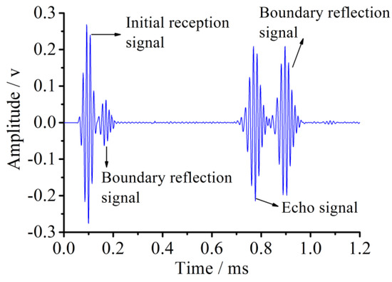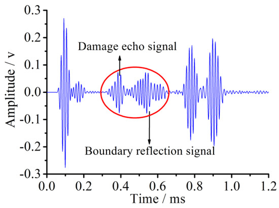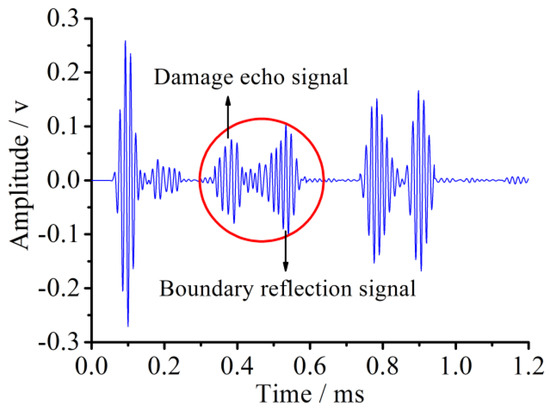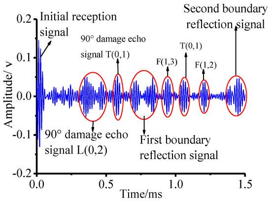 The received voltage signal in the sensor for the pipe with 45° damage is shown in Figure 14, which reveals that two superimposed waveforms between the initial reception signal packages and the echo ones are observed when compared with the received signal of the healthy pipe. In two middle wave signal packages, the left one is the damage echo signal from the original one, and the right one is also a damage echo signal from the left boundary reflection one. The clear identification of the damage reflected signal is of great importance and efficiency because it contains useful information on the damage, such as the damage location and level, which are the two main goals of the damage identification.