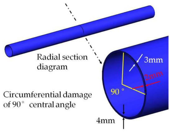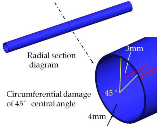 In order to investigate the propagating behavior of a PZT guided wave-based signal in a damaged pipe structure, a typical damage along the circumferential direction is introduced on the surface of the pipe. Shear type piezoceramic elements are used for the simulation of PZT transducers. A circumferential damage with the radius angle of 45°, the maximum depth of 3 mm, and the longitudinal width of 2 mm which is located at the distance of 1000 mm from the PZT actuators (700 mm from the PZT sensors) is arranged. The circumferential damage in the damaged cross-section and the location along the longitudinal direction of the pipe are shown in Figure 11 and Figure 12, respectively. Moreover, the circumferential damage is modeled in the process of “cut extrude” in the “part” model, and then the whole pipe is meshed. Thus, the nodes outside the circumferential damage were disconnected, as seen in Figure 13.