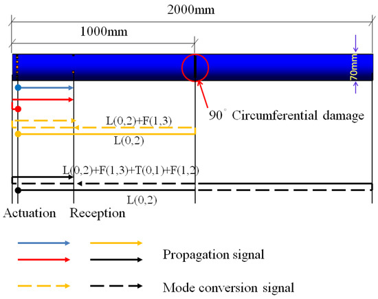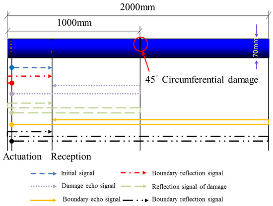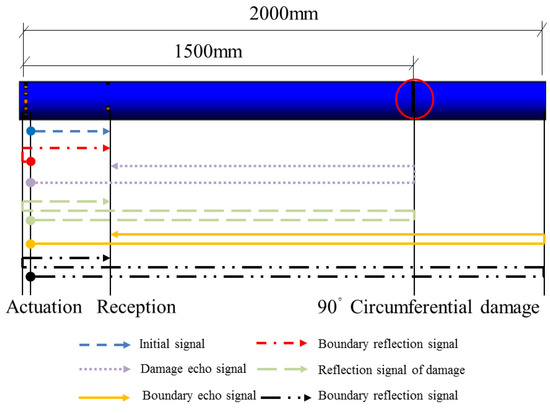 The schematic of signal propagation in the pipe with circumferential damage (90°) in the simulation.